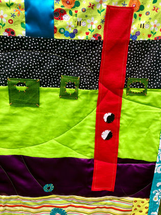 This piece had multiple challenges. The first was to create two sides that simultaneously ‘went together’ for purposes of display, but also stood on their own as a look. To that end, the overall color scheme holds for both sides, and some of the fabrics are ‘cross overs’, being used on both sides of the quilt. The best part: it was all done with remnant fabrics we had been hoarding for just such a use. Another challenge was all of the hand work involved—reverse, hand stitched applique, stacked layers of hand stitched applique, “negative space” applique, etc. Yet another challenge was the variety of fabrics we chose to use. There are some ‘traditional’ quilt fabrics, but there is also drapery fabric, upholstery fabric, stretchy rayon blends, fleece, felt, bits of leather (!) and a kind of undefinable black circles ‘netting’ direct from the New York Garment District. Getting all of this to go together was most definitely a challenge.