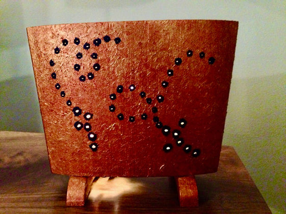 We found a wonderful chunk of white cottonwood on a recent trip to a regional lumber yard and finally decided to use it to create this nifty little “nightlight” lamp. From the rectangular chunk of wood, we cut a blunt crescent shape out on the bandsaw, glued it up, and when it was dry, cut the perimeter to match. From the inner plug we made the bottom just as we would make a bandsaw box, but this time we drilled a hole in it to accept a removable LED bulb. Instead of making a ‘lid’ from the wood, we made one from a cool piece of streaked, rippled stain glass. We then created an abstract design on the sides and drilled little holes to let the light shine through. After lots of sanding, we used acrylic paints to give the interior a reflective white interior and a blended copper and bronze sheen exterior. We then decorated the light hole design on the sides with a lovely purple to match the streaks in the stained glass lid.