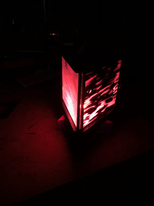 This lamp is a prototype that represents a new design and construction style we are exploring. It is simplistic in design so we could focus on learning some new techniques. We made use of 3 readymade squares of glass approximately 6” x 6”. We framed these in zinc came so we could practice cutting techniques and soldering. We also used a Dremel to burnish the metal to give it a more polished finish and to blend the soldered corners in with the rest of the metal. We used scrap tulip poplar from another project for the base and lid, resawing the piece to create top and bottom. We routed the grooves in on both pieces to capture the glass, and found other scrap pieces of poplar for the feet and finial. The feet were fortuitously cut almost as if they were made for this project, with a right angle cut-out that was perfectly fitted, and an angle that makes the piece look as if it is somehow rotating.