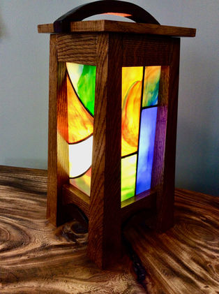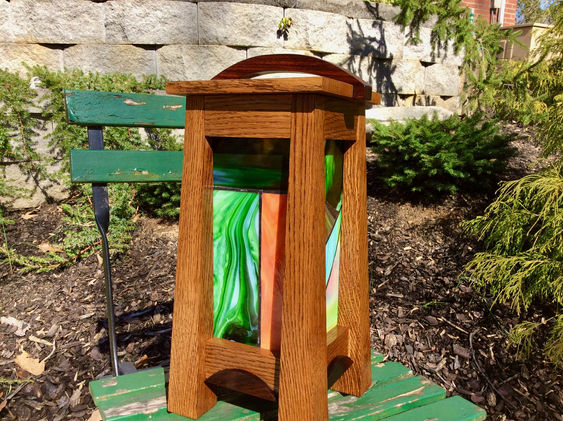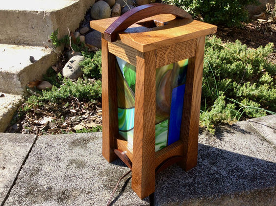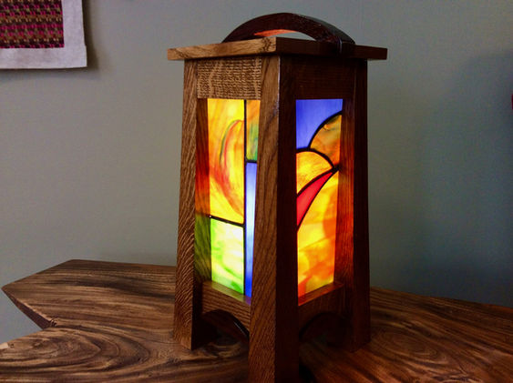 This lamp has two sources of inspiration in our past creations. First, it emulates a walnut and stained glass lamp we made some time ago in its blend of Western and Eastern influences—kind of like Mission Style meets Japanese pagoda. But that lamp had individual captured pieces of stained glass and this new one has soldered panels. That lamp was joined with dowels and this new one is a system of mortise and tenons. Both have a lid with a mortised center opening, but we took it one step further in this new lamp and added a decorative handle to the lid. The second source of inspiration for this lamp was our recently created Mission Style mantle clock. This lamp has the same flared corners but is made of solid Tiger Oak. And its overhanging lid, like that of the clock, balances the flares of those legs.