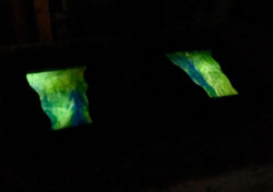 We got a request to do a modified version of our original River Sconce pair, still using African Sapele as the wood, but with a more opaque blue-green glass as the 'river'. We took the opportunity to improve a bit on the original design by making the wood case and face slightly larger and thicker. This gave us extra room inside the case to store the smaller battery pack and hide the wiring for the lighting, to avoid the unwanted-in-this-case industrial look of the sconce when the light was switched on. The choice of a more opaque glass also served this purpose and at the same time made for a much more dramatic look of churning water with hand-poured Kokomo glass. The thicker case allowed for biscuit joined corners and a wider rabbet around the back for placement of the backer material.