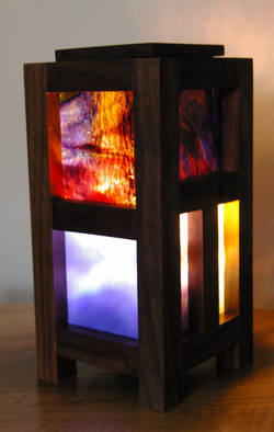 The frame, base and lid were cut from a single board of American walnut and all of the rails and stiles of the frame are held together with a series of hidden dowels. The panels are made from an assortment of five different types of stained glass, cut and ground to fit, and held in place with framing pins. We love the blues and purples of this lamp whether it is lit or not! In our home, the prototype lamp lives on a matching live edge walnut console table in our family room, and this lamp, too, would be suitable for a casual family room, a home office, or even an entryway or hallway—really anywhere that colorful accent or mood lighting is desired.